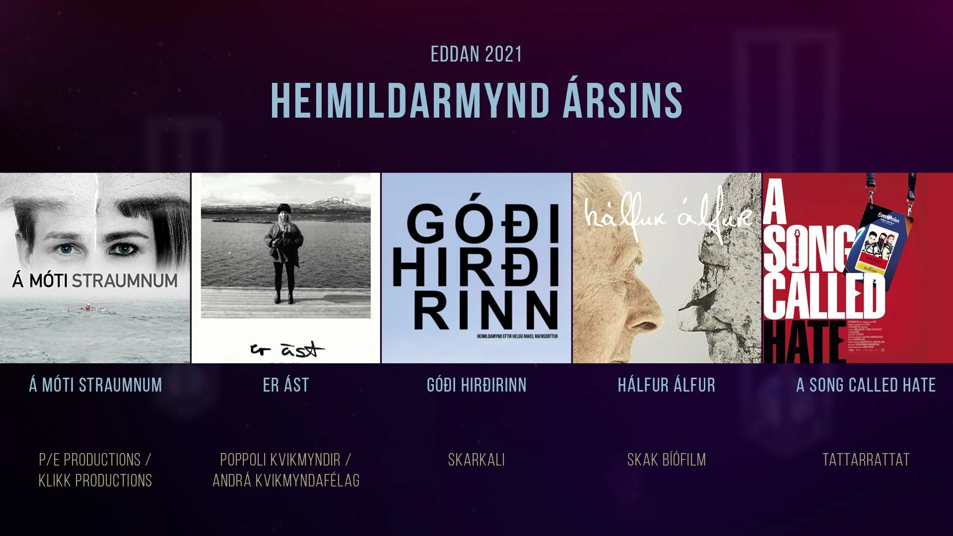 Er ást, documentary on Helena Jónsdóttir and Þorvaldur Þorsteinsson got nominated in two categories at the Eddan Icelandic film and television awards 2021. The categories are Best Documentary and Best Editing.